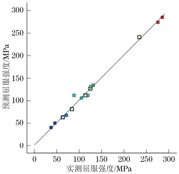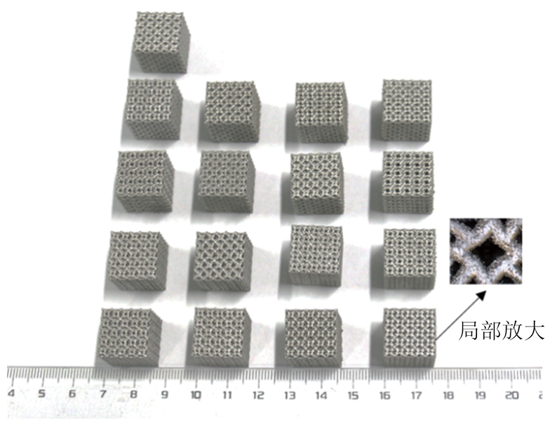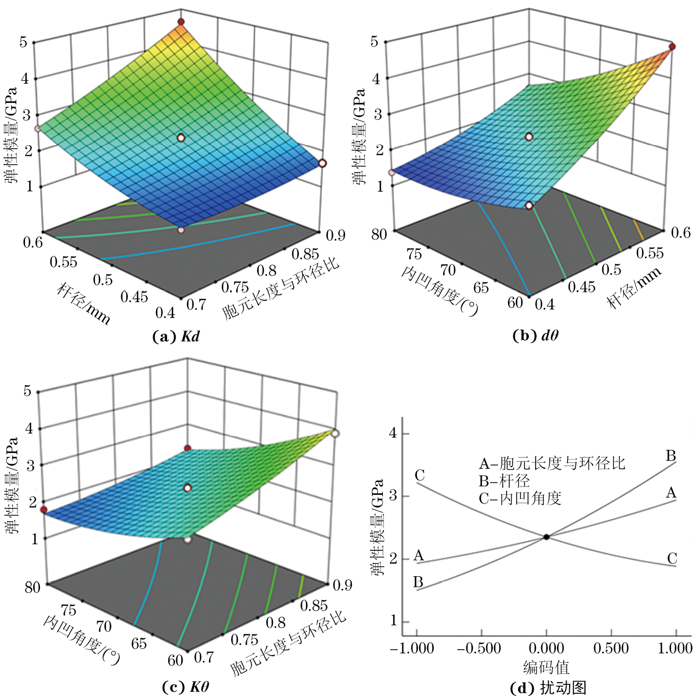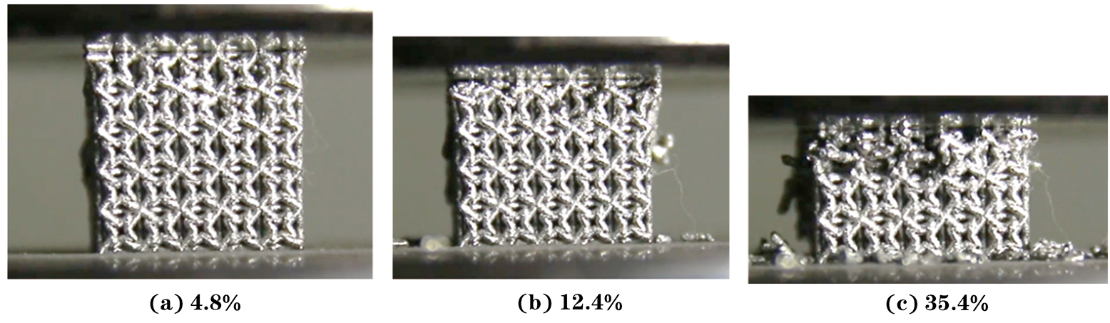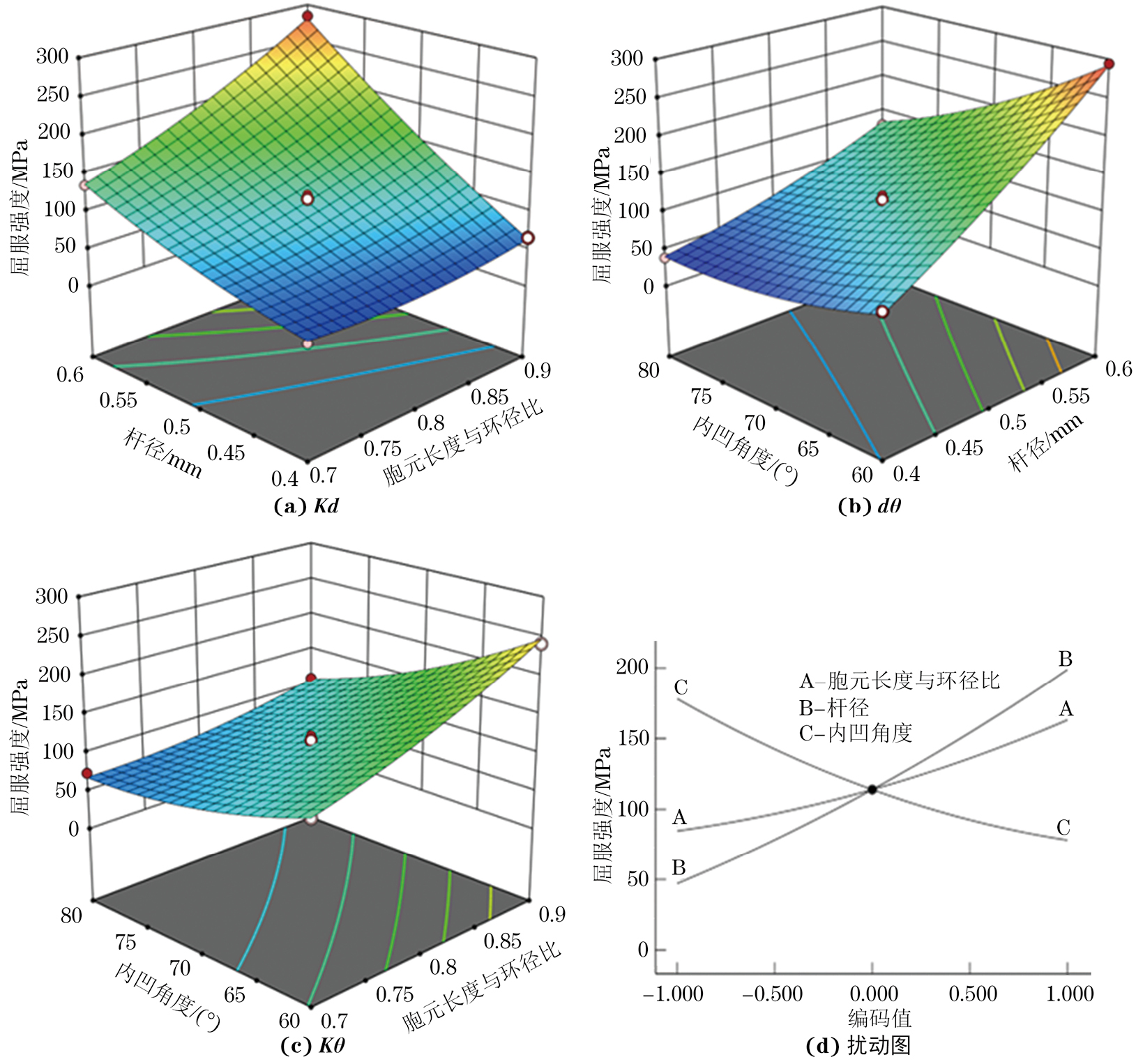 摘要: 基于手性结构和内凹结构设计了一种新型复合负泊松比多孔结构;采用Ti6Al4V钛合金球状粉末,通过选区激光熔化成形技术制备了复合结构试样,基于响应曲面法研究了胞元长度与环径比(0.7~0.9)、杆径(0.4~0.6 mm)和内凹角度(60°~80°)及其交互作用对复合结构试样弹性模量和屈服强度的影响,获得优化的胞元结构参数。结果表明:当孔隙率为75%时,复合结构试样的弹性模量和屈服强度介于手性和内凹结构试样之间;采用小胞元长度与环径比、小杆径和大内凹角度时,复合结构试样的弹性模量较低,采用大胞元长度与环径比、大杆径和小内凹角度时,屈服强度较高;复合结构的优化参数为胞元长度与环径比0.9、内凹角度60.1°、杆径0.546 mm,预测得到该优化复合结构试样的弹性模量为3.71 GPa,与试验值(3.65 GPa)的相对误差为1.64%,说明采用响应曲面法建立的负泊松比结构参数与力学性能关系模型可靠,实测该复合结构试样的屈服强度高达210.36 MPa。Abstract: A new composite porous structure with negative Poisson's ratio was designed based on the chiral structure and concave structure. The composite structure samples were prepared with Ti6Al4V spherical powder by selective laser melting forming technique. The effects of ratio of cell length to ring diameter (0.7—0.9), rod diameter (0.4—0.6 mm), concave angle (60°—80°) and their interactions on the elastic modulus and yield strength of the samples were analyzed by response surface methodology, and the cell structure parameters were optimized. The results show that when the porosity was 75%, the elastic modulus and yield strength of the composite structure sample were between those of the chiral and the concave structure samples. The elastic modulus of the composite structure sample was low when the ratio of cell length to ring diameter and rod diameter were small, and the concave angle was larg. The yield strength was high when the ratio of cell length to ring diameter and rod diameter were larg and concave angle was small. The optimization parameters of the composite structure were listed as follows: ratio of cell length to ring diameter of 0.9, concave angle of 60.1° and rod diameter of 0.546 mm. The predicted elastic modulus of the optimized composite structure sample was 3.71 GPa, and the relative error to the test value (3.65 GPa) was 1.64%, indicating that the model of relationship between negative Poisson's ratio structure parameters and mechanical properties established by the response surface methodology was reliable. The measured yield strength of the optimal composite structure sample reached 210.36 MPa.