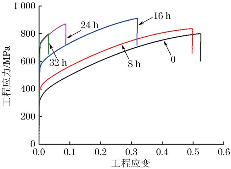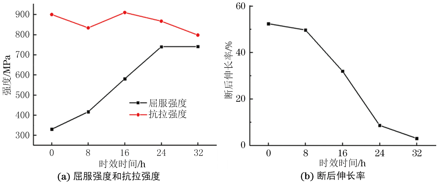 3Al phase increased. With the extension of aging time, the yield strength of the alloy increased first and then tended to be stable, the tensile strength had no obvious change, and the percentage elongation after fracture decreased. When the aging time was 24 h, the yield strength of the alloy was the highest of 740 MPa, the tensile strength; percentage elongation after fracture were moderate, which were 886 MPa and 9%, respectively; the comprehensive tensile property was relatively good.