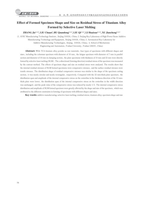 Key words: additive manufacturing; selective laser melting; residual stress; titanium alloy; specimen shape and size