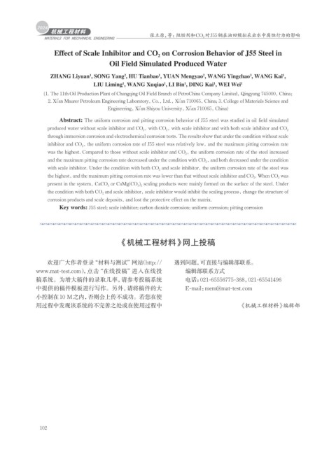 Key words: J55 steel; scale inhibitor; carbon dioxide corrosion; uniform corrosion; pitting corrosion