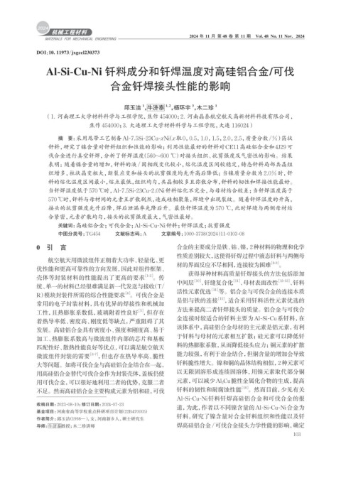 不足。然而高硅铝合金主要构成元素为铝和硅,可伐 钎料的韧性和耐腐蚀性能 [16] 。然而目前,少见有关