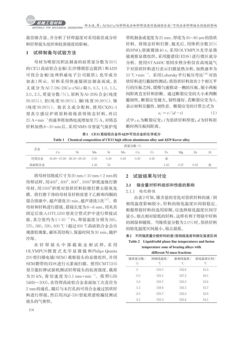 Table 1 Chemical composition of CE11 high silicon alumimum alloy and 4J29 Kavor alloy