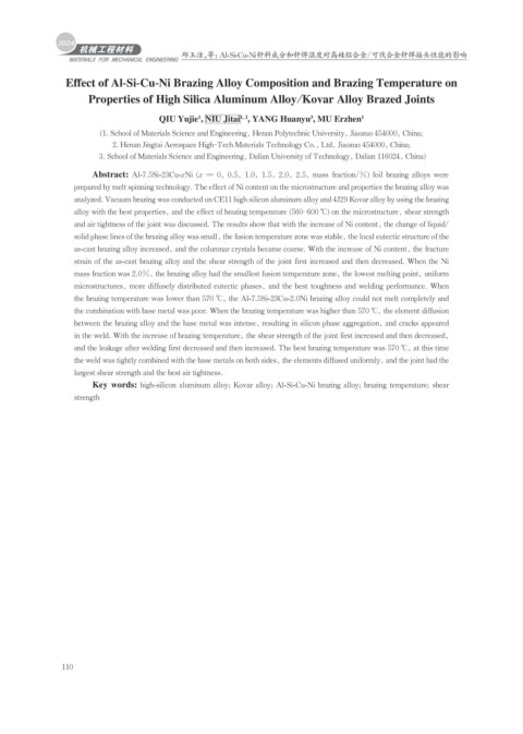 Abstract: Al-7.5Si-23Cu-xNi (x = 0, 0.5, 1.0, 1.5, 2.0, 2.5, mass fraction/%) foil brazing alloys were