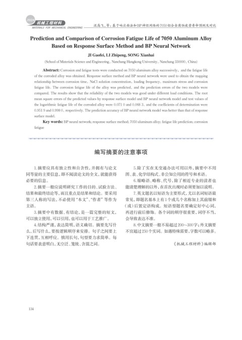 Key words: BP neural network; response surface method; 7050 aluminum alloy; fatigue life prediction; corrosion