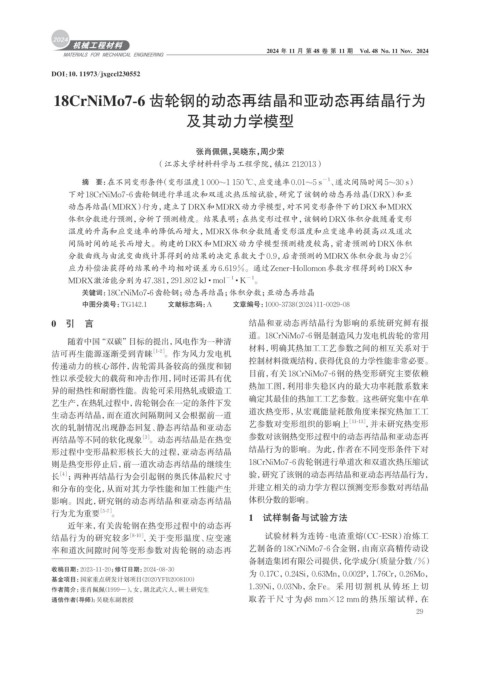 关键词: 18CrNiMo7-6齿轮钢;动态再结晶;体积分数;亚动态再结晶