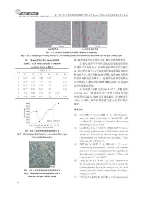 6 8.09 56.44 20.52 7.74 3.73 3.49 10道堆焊层连续、致密且界面无裂纹,显微硬度在