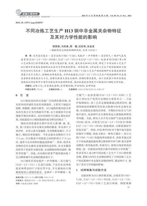 H13钢中非金属夹杂物特征及其对力学性能的影响。结果表明:4种冶炼工艺生产的试验钢回火组