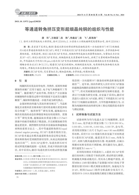 金属材料的性能与其组织密切相关 ,当晶粒 形后T2纯铜的显微组织、力学性能和腐蚀行为,以