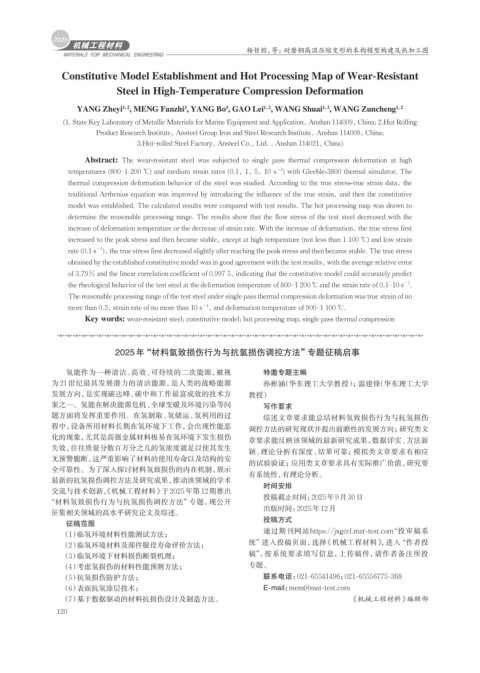 Key words: wear-resistant steel; constitutive model; hot processing map; single pass thermal compression