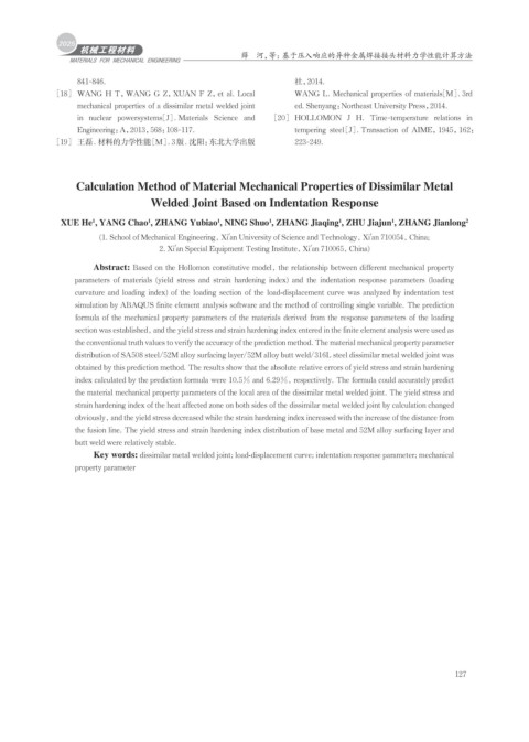 Key words: dissimilar metal welded joint; load-displacement curve; indentation response parameter; mechanical