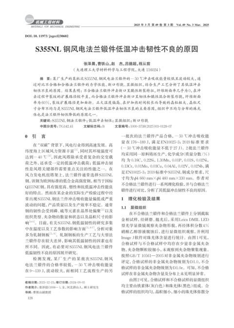 关键词: S355NL钢法兰锻件;低温冲击韧性;显微组织;断口形貌