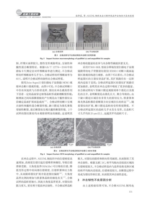 唇,纤维区面积较大,塑性变形现象明显,呈韧性和 冲击吸收能量的差异与夹杂物等缺陷因素无关。