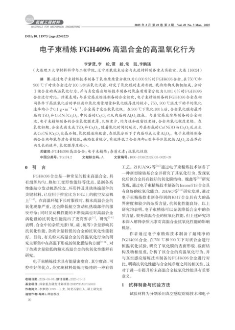关键词: FGH4096高温合金;电子束精炼;杂质元素;抗氧化性能