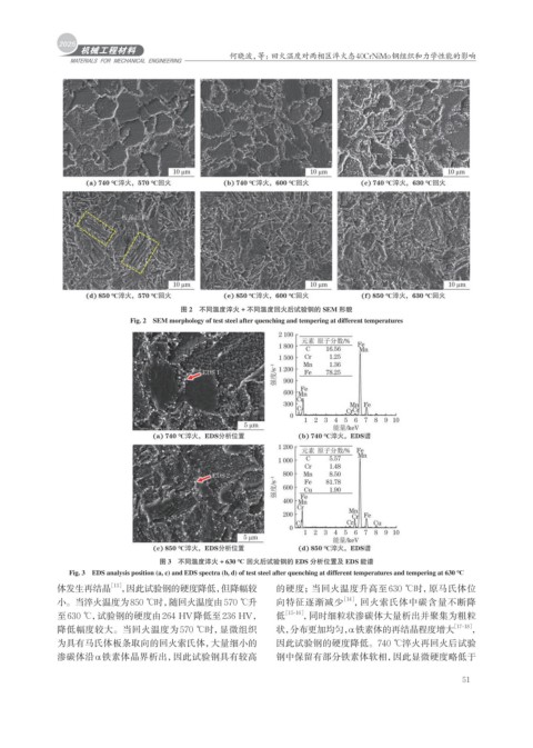 小。当淬火温度为850 ℃时,随回火温度由570 ℃升 向特征逐渐减少 [14] ,回火索氏体中碳含量不断降