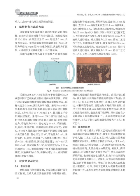 度为60 mm。挺柱截面显微组织如图1(b)所示,表 作工艺2; 先用钢丸进行喷丸,喷丸强度为0.30 mm,