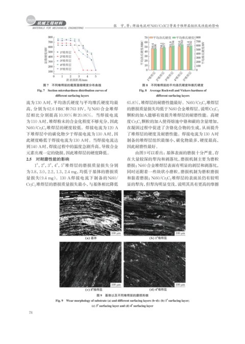 流为130 A时,平均洛氏硬度与平均维氏硬度均最 65.8%,堆焊层的耐磨性能最好。Ni60/Cr 3 C 2 堆焊层